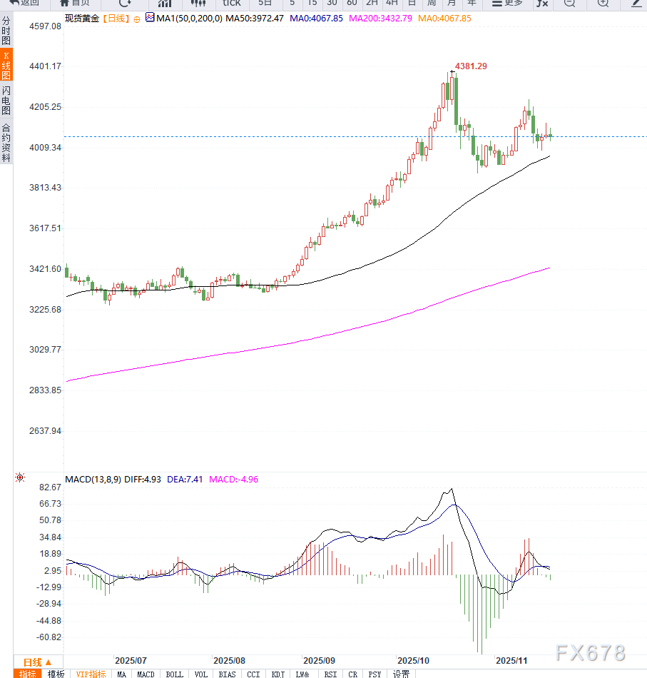 跌破这一水平,金价可能重新考验4000美元心理关口以及3930美元的阶段支撑,甚至有机会回测10月末的3886美元区域。反之,若行情突破4120美元,则可能开启一轮修正性上行行情,目标指向4155美元与4200美元整数位。