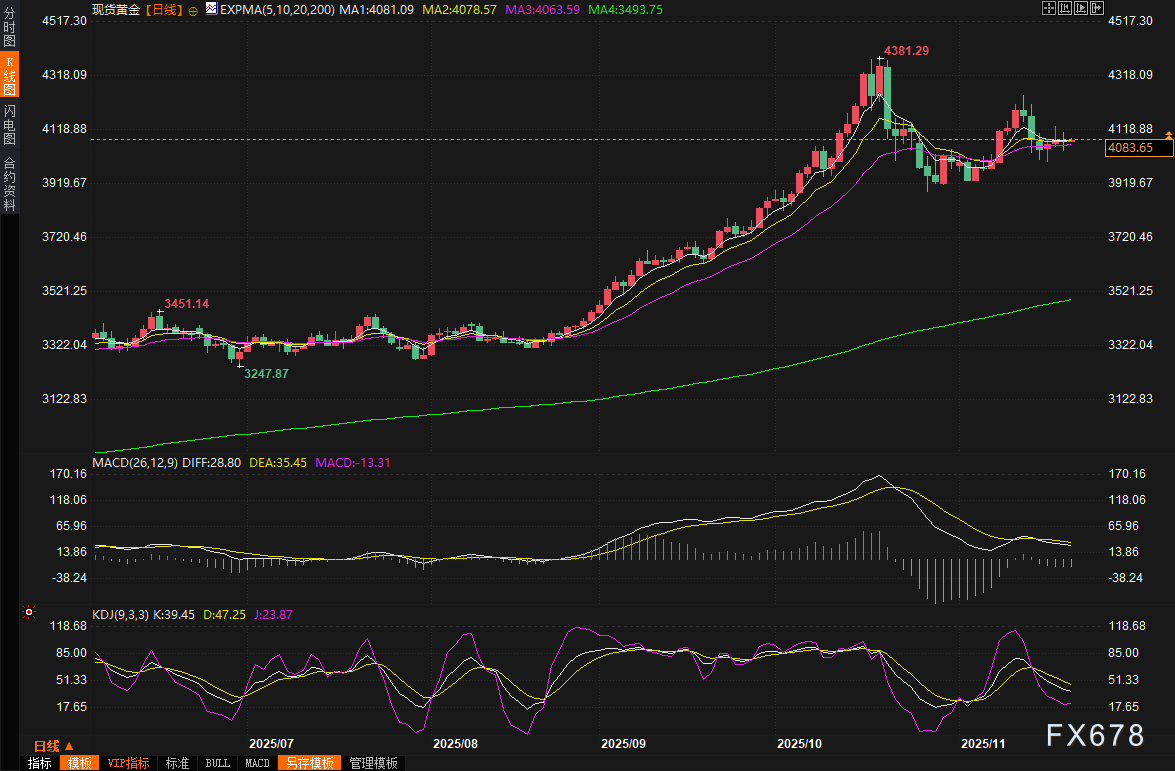 周四(11月20日)现货黄金在剧烈震荡中顽强收稳,收报4077.17美元/盎司,全天最高冲至4110.03美元,最低跌至4038.82美元,波动幅度超过70美元。这波看似平静的横盘,实则暗流涌动——美国迟来的9月非农就业报告彻底打乱了市场节奏,既浇灭了部分降息幻想,又因为失业率意外抬升而重新点燃了鸽派希望。黄金作为最敏感的利率交易品种,再一次站在了风口浪尖。周五(11月21日)亚市早盘,现货黄金窄幅震荡,目前交投于4085美元/盎司附近,市场目光开始聚焦美国提出的俄乌和平计划。