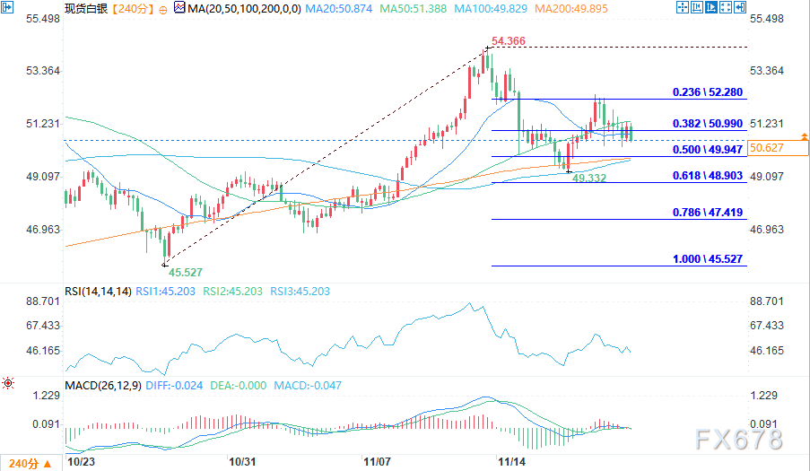 从上行来看,若价格能站稳 0.382 斐波那契回撤位 50.990,且 20均线、50均线呈现多头排列,RSI 未进入超买区域,MACD 红柱持续放大,那么价格有望向 0.236 回撤位 52.280 发起冲击。