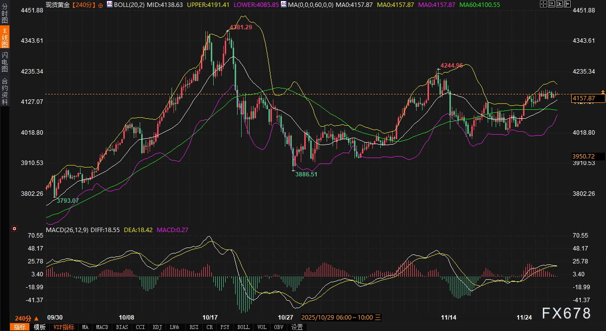 金价目前稳定地位于60周期简单移动平均线(60SMA:4100.56)之上,该均线构成了近期回落的重要动态支撑。价格在均线上方的整固,表明自10月高点以来的回调可能只是长期上升趋势中的一次健康修正,而非趋势的反转。只要金价能坚守在4100美元上方,短期技术结构就仍偏向积极。