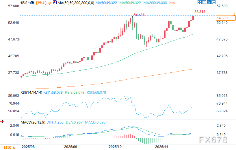 汇通财经APP讯——周五(11月28日)早盘,现货白银价格盘中攀升至55.313美元/盎司,突破历史新高。