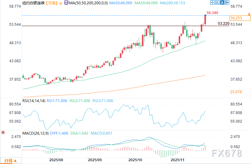 汇通财经APP讯——周五(11月28日)美国早盘交易中,黄金和白银价格走高,其中白银期货大幅上涨并创下历史新高。受技术图表形态推动,两种金属本周短期技术面均呈现更强看涨态势。2月交割黄金期货上涨38.8美元,报4241.1美元/盎司;3月交割白银期货上涨2.608美元,报56.215美元/盎司。