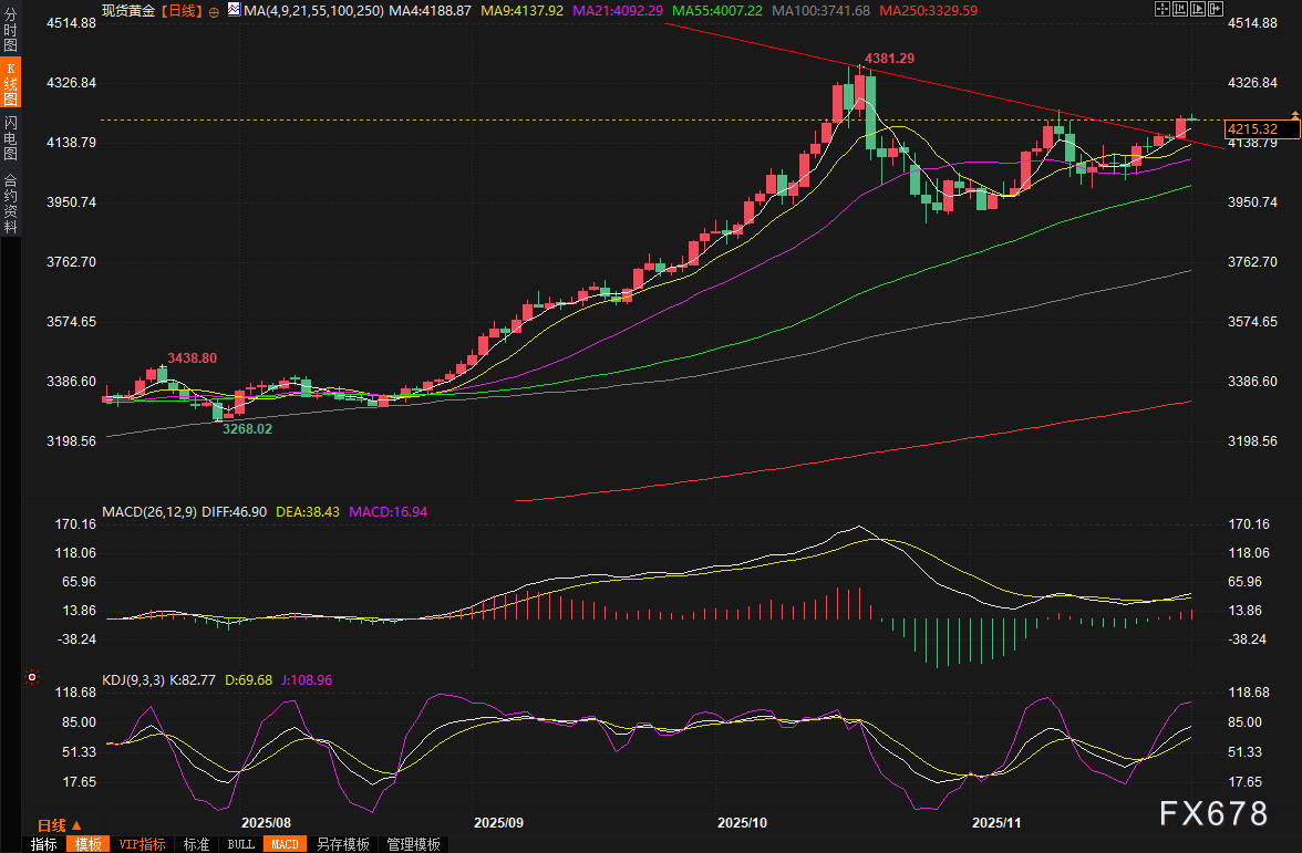 汇通财经APP讯——现货黄金在上周五(11月28日)强劲冲高,涨幅达到1.5%,触及两周新高4226.56美元/盎司,最终收报4219.20美元/盎司。从月线来看,金价11月上涨5.4%,这已经是连续第四个月的上涨,显示出市场对黄金的持续青睐。周一(12月1日)亚洲时段,现货黄金继续保持涨势,一度刷新高点至4230.41美元/盎司。这种连续上涨的格局并非偶然,而是受到了宏观经济环境和货币政策预期的双重支撑。投资者们将黄金视为对抗不确定性的盾牌,尤其是在经济增速放缓的预期下,黄金的不孳息特性变得格外吸引人。