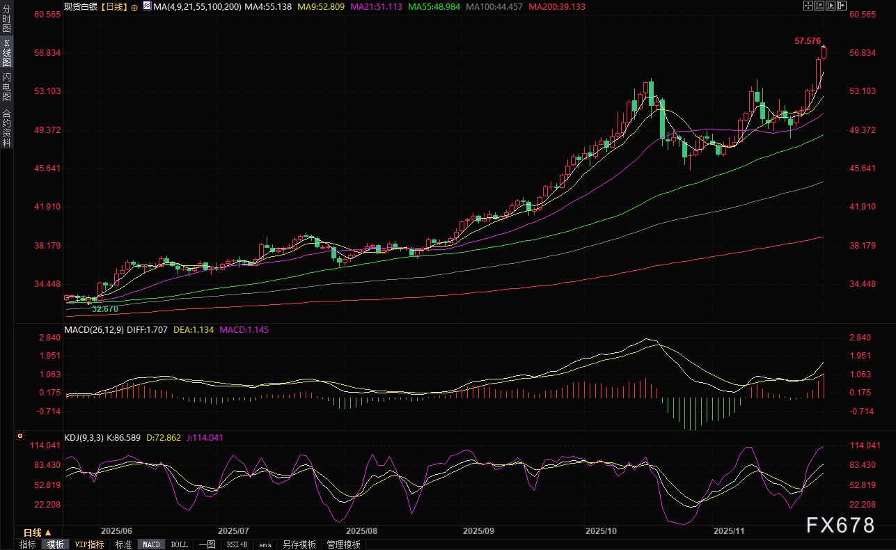 因价格波动剧烈而被戏称为“魔鬼金属”的现货白银周一(12月1日)亚市早盘延续涨势,再度创下历史新高,截止09:00,一度达57.57美元/盎司,涨幅约2.1%,为连续六个交易日走高,专家指出,尽管面临供应紧张,白银仍有进一步上涨空间。白银的增值走势与黄金并驾齐驱。