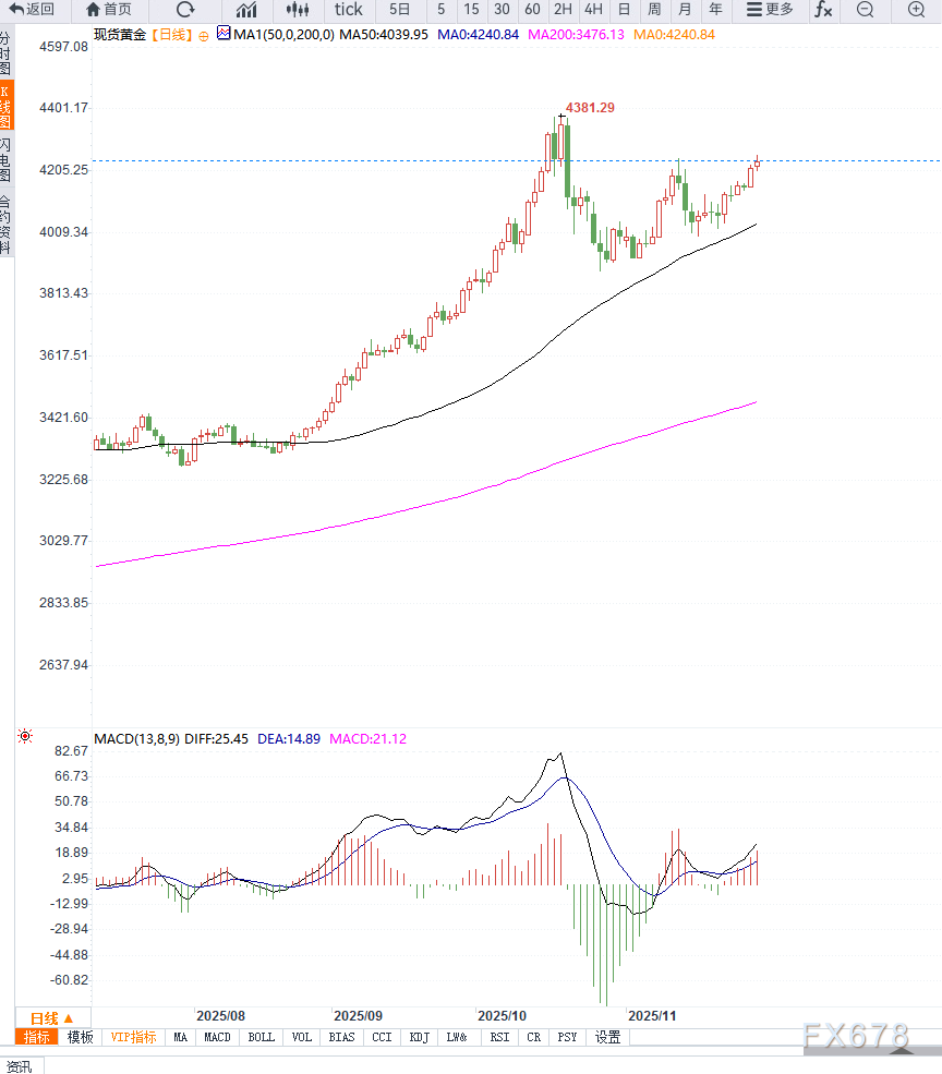 从黄金(XAU/USD)日线结构来看,当前价格在4230美元上方维持强势平台整理,整体呈“多头趋势中的高位震荡”特征。均线系统保持多头排列,20日均线对价格形成明显支撑,而价格多次回踩该均线后企稳,显示短线买盘韧性仍强。