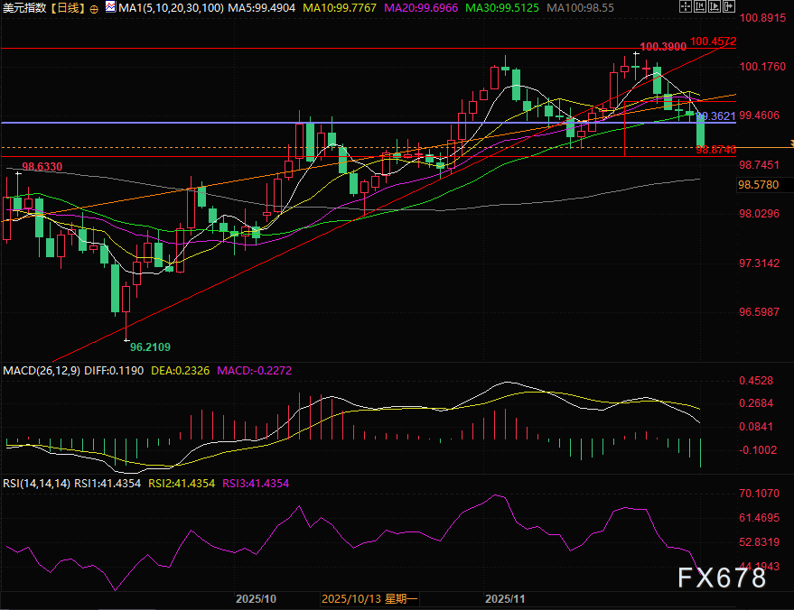 美元指数日线图显示美元指数的量度跌幅满足暂时在98.87附近,暗示在美元完成跌幅满足之前,美元可能继续调整,银价有机会尝试防守并守住中轨,或者继续扩大战果,而美元指数止跌后,白银可能回调开始测试支撑。