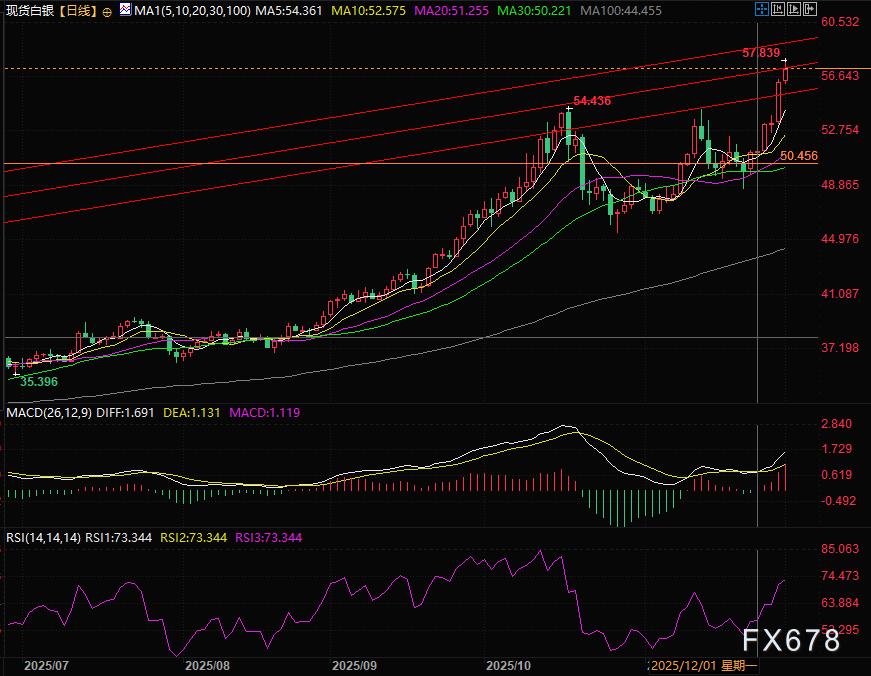 —周一(12月1日)亚欧时段,白银价格继续刷新了历史新高,盘中最高触及每盎司57.83美元,目前现货白银交投于57.14附近,涨幅1.3%。