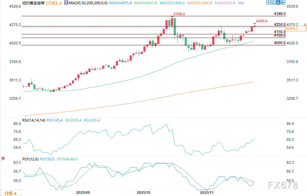 汇通财经APP讯——周一(12月1日)美国早盘交易中,黄金和白银价格走高,其中黄金触及六周高点,白银创下历史新高。新交易周暨新月份伊始,受日本债市引发的市场恐慌情绪影响,避险买盘成为市场主流;同时,由于两种金属近期的短期技术形态愈发偏向多头,技术驱动型买盘也对价格形成支撑。2月交割的黄金期货盘中上涨11.9美元,报4266.8美元/盎司;3月交割的白银期货价格盘中上涨1.822美元,报58.985美元/盎司。