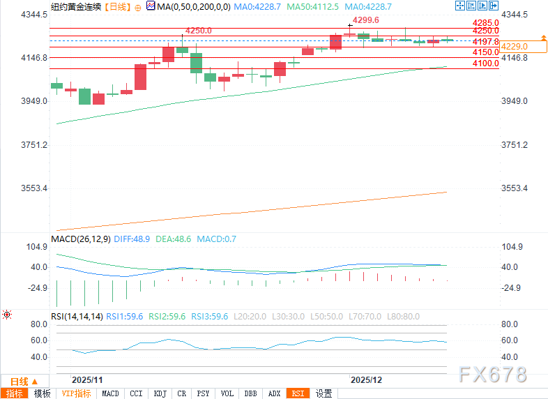 技术面分析:对于2月黄金期货,多头的下一个上行目标是推动期货收盘价突破4433.00美元/盎司的合约高点/历史纪录高位这一强劲阻力位;空头的近期下行目标则是将期货价格压至4100.00美元/盎司的强劲技术支撑位下方。第一阻力位见于本周高点4251.70美元/盎司,其次是4285.00美元/盎司;第一支撑位为本周隔夜低点4197.80美元/盎司,其次是4150.00美元/盎司。