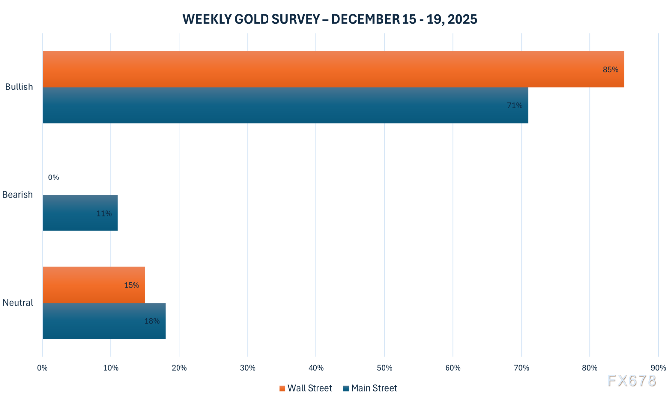 最新的Kitco新闻每周黄金调查结果令人振奋,华尔街分析师中85%预计未来一周金价将上涨,无人看跌,仅15%认为将横盘整理。Adrian Day等专家指出,美联储大规模购买国债(虽不称为量化宽松)对黄金构成利好。散户投资者方面,71%看涨黄金,显示主街情绪同样强劲。