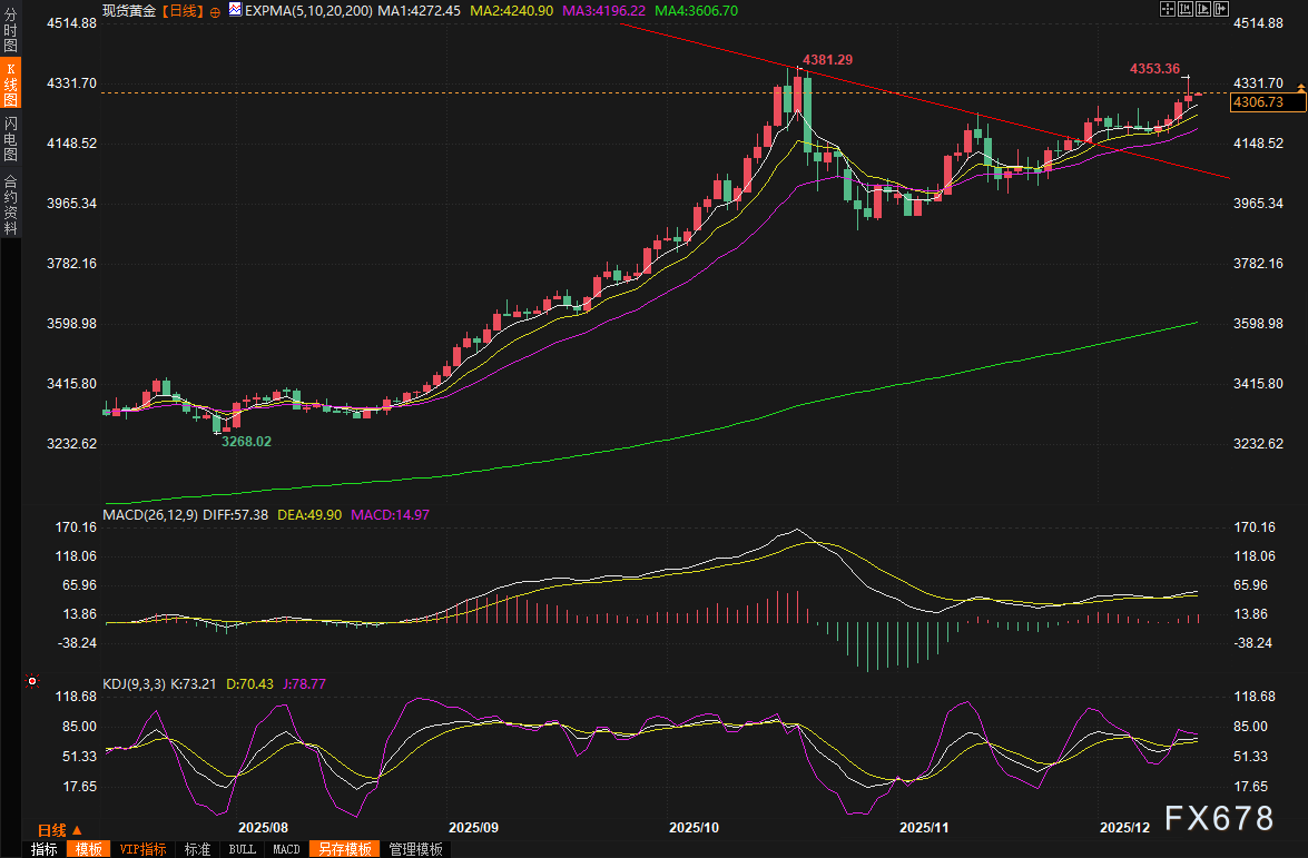 上周五(12月12日)金价表现出色,现货黄金上涨0.48%,收报每盎司4300美元附近,盘中最高触及4353美元/盎司,这是自10月21日以来的最高水平。美国期金也收涨0.4%,结算价达到4328.3美元。这种上涨势头让黄金多头信心满满,尤其是在美联储上周第三次降息25个基点后,市场对宽松货币政策的预期进一步升温。
