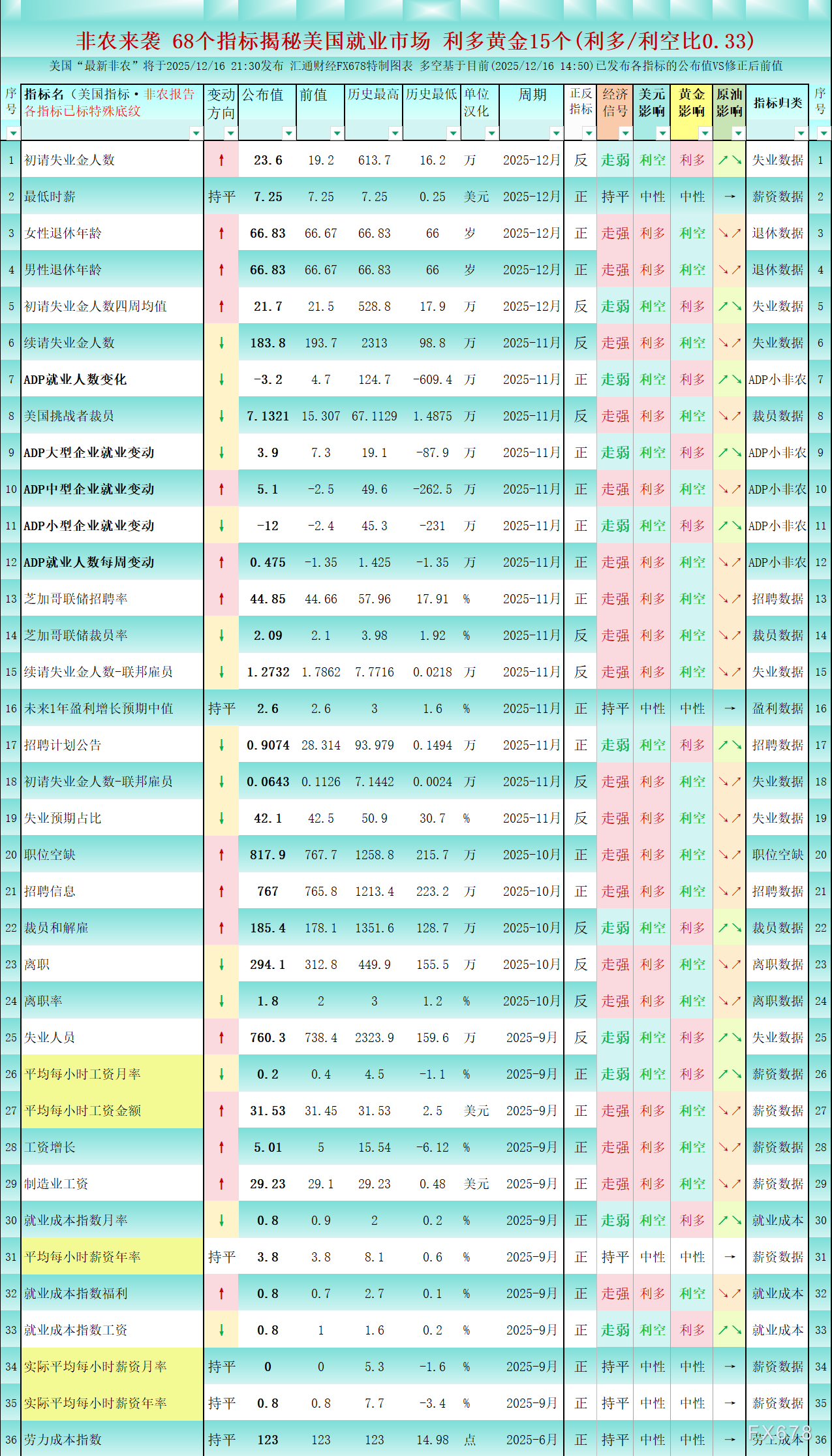 汇通财经APP讯——一张图:美国非农数据来袭 68个美国就业关联指标 利多黄金的仅15个。美国“最新非农”将于2025/12/16 21:30发布,市场密切关注。堪称金融市场必备打卡的美国非农”,将会如何影响市场?今晚即将揭晓。本文原创特制图表或可提前窥探一二。
