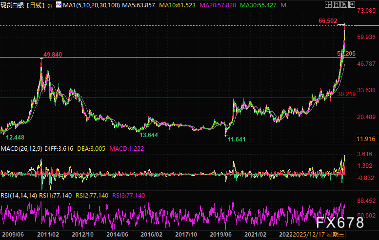 —周三(12月17日)亚欧时段,现货白银在周二调整守住五日线后继续上涨,盘中一度涨至4.16%,目前交投于65.90美元/盎司附近。