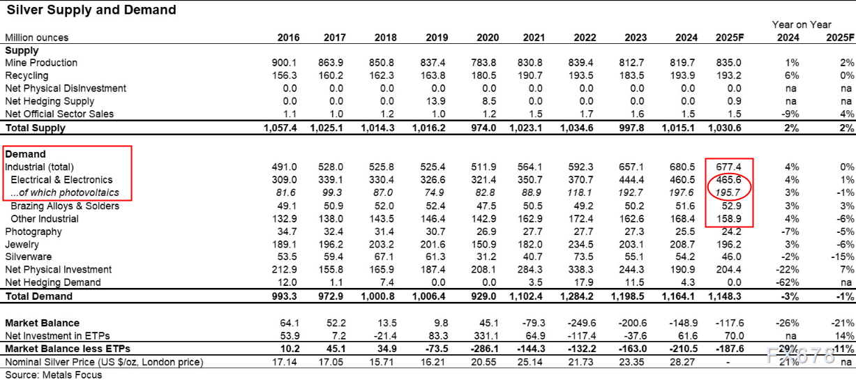 其中电子和电气又占工业用银的68%,光伏占工业用银的29%,注意这还是2024年的统计,在2025年AI大规模用电背景下,在电气传输,储能等领域设备的扩容,会让银的需求量更上一个台阶,这是人类历史上绝无仅有的情景。