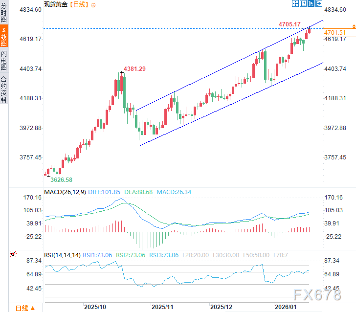 汇通财经APP讯——周二(1月20日)亚市时段,现货黄金震荡上涨,日内涨幅约0.6%,现交投于每盎司4700美元附近,截至13:40,现货黄金刷新历史高点达4705.36美元/盎司。由于错综复杂的基本面支撑,避险买盘仍不断涌入黄金。
