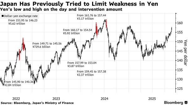 Pepperstone Group Ltd.高级研究策略师Michael Brown在谈及干预时表示:“汇率检查通常是采取此类行动之前的最后一次警告。高市早苗政府对投机性外汇波动的容忍度,似乎比前任要低得多、低得多。” 有关汇率检查的报道,可能会让市场不敢进一步尝试压低日元,从而挤压日元空头仓位——这类仓位近期出现了十多年来最大幅度的增加。 外汇市场波动加剧的同时,日本国债也陷入动荡。上周前半段,超长期国债收益率一度飙升至历史纪录,随后回落。 悉尼AT Global Markets首席分析师Nick Twidale早些时候表示:“鉴于高市早苗的表态,交易员在周一开盘时应格外谨慎。”他称,日元兑美元在本周初可能会在155附近交易。 日本政府在2024年斥资接近1000亿美元买入日元以支撑汇率。在四次出手时,日元兑美元汇率都在约160附近,这也使得160这一水平大致成为市场判断未来可能再次采取行动的参考线。