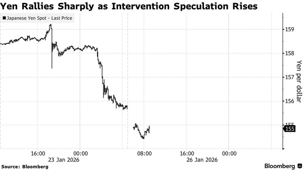 美元/日元目前跌至154.00关口,日内重挫175点。此前,日本首相高市早苗(Sanae Takaichi)周日向市场发出警告,且上周五出现迹象表明美国或将与日本联手捍卫日元。日本股市下跌,日经225指数下挫1.9%;基准10年期国债走高。