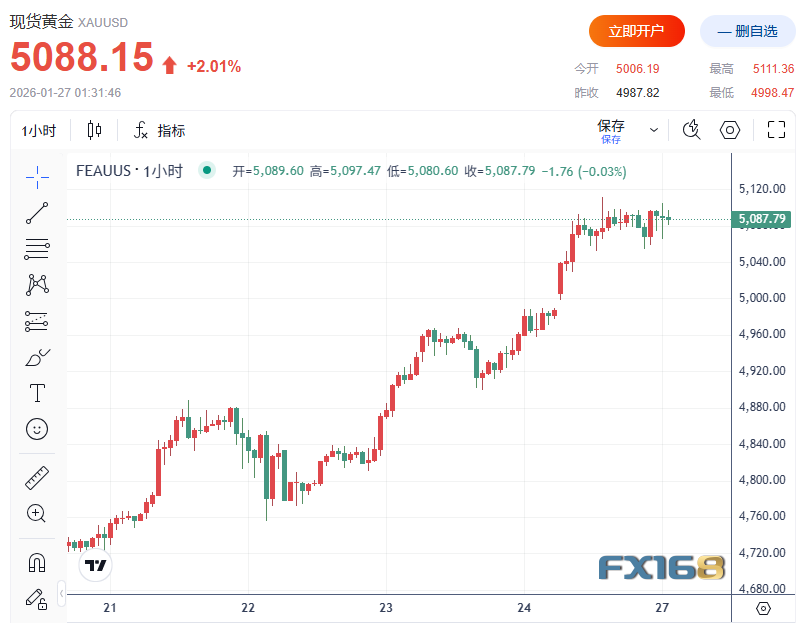 FX168财经报社(北美)讯 周一(1月26日),汇市与贵金属市场的“避险链条”被全面点燃:在市场押注美日可能协同行动支撑日元之际,美元跌至四个月低点,日元强势反转;美元走弱叠加对美国政策不确定性与政府停摆风险的担忧,推动黄金史上首次站上5000美元并一度上探5100美元上方,白银则暴涨超11%至115美元创纪录。与之形成对照的是,美股在风险与避险并行的背景下仍实现反弹,投资者把目光转向本周的美联储利率决议以及科技巨头财报潮,市场波动或进一步放大。
