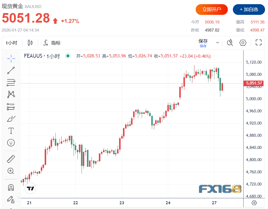 与此同时,现货黄金一度较日内所创新高回落超100美元,至5008.23美元/盎司。