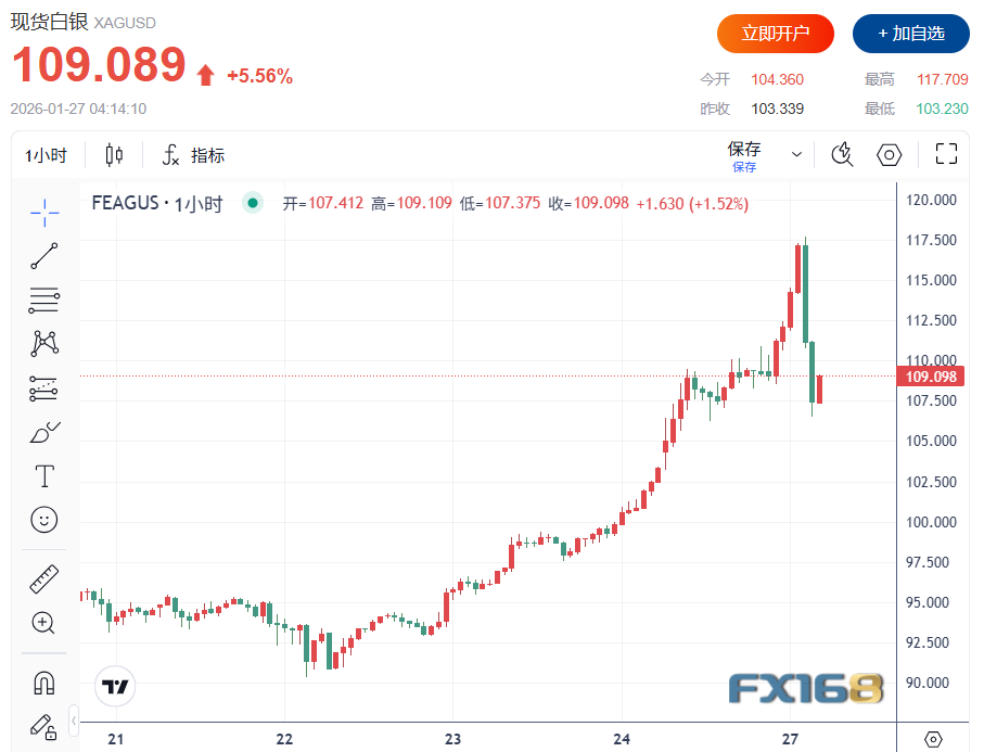 过去一年里,黄金和白银价格,以及铜等其他金属价格持续上行。今年早些时候,黄金(“黄金属”)历史上首次突破5000美元/盎司。 当然,在同一时间跨度内,白银的表现优于黄金。这一方面得益于白银与“货币贬值/购买力下降”交易主题的关联,另一方面也来自其在人工智能技术建设浪潮中的重要角色。 更广泛的工业需求仍是白银这轮“火热”行情的重要推手:过去一个月白银累计上涨40%,并在同比层面录得约260%的涨幅。 现货白银一小时下跌超8.6美元,现报109.089美元/盎司,此前一度涨超14%至117.709美元/盎司。