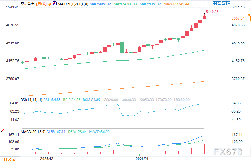 汇通财经APP讯——周一(1月26日)美盘时段,现货黄金在周一早些时候突破5000美元心理关口后继续攀升。在触及5111.51美元的历史新高后,市场暂时停顿,交易员等待纽约商品交易所(Comex)期货开盘。地缘政治风险是今日上涨的原因之一。