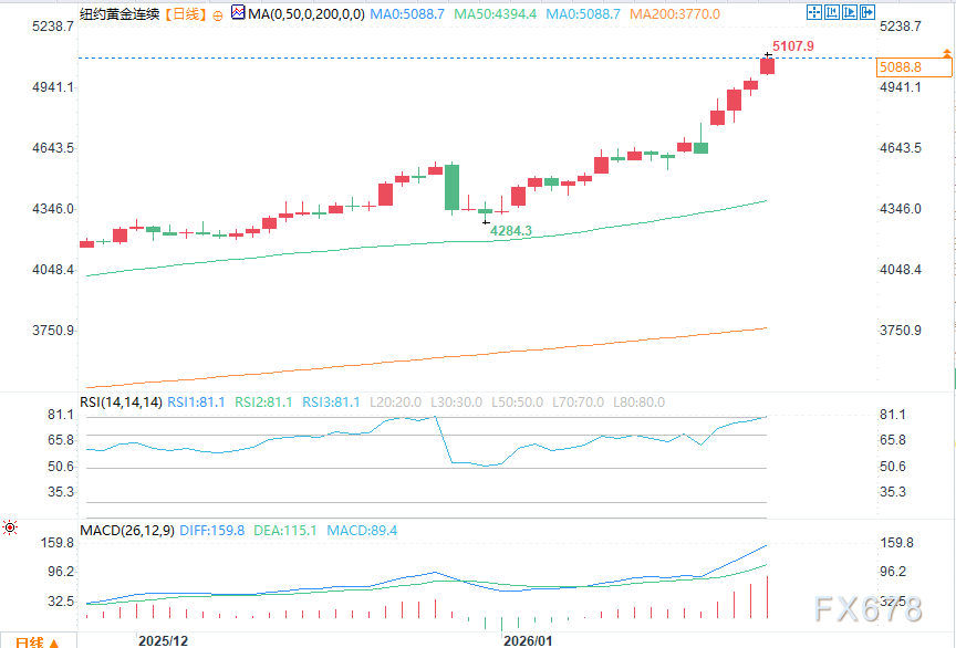 2月黄金期货:多头占据绝对技术优势,下一上行目标是收盘价突破关键阻力位5250.00美元/盎司;空头的近期下行目标是推动期货价格跌破关键技术支撑位4750.00美元/盎司。第一阻力位为隔夜历史高点5107.90美元/盎司,进一步阻力位在5200.00美元/盎司;第一支撑位为5000.00美元/盎司,进一步支撑位在4950.00美元/盎司。