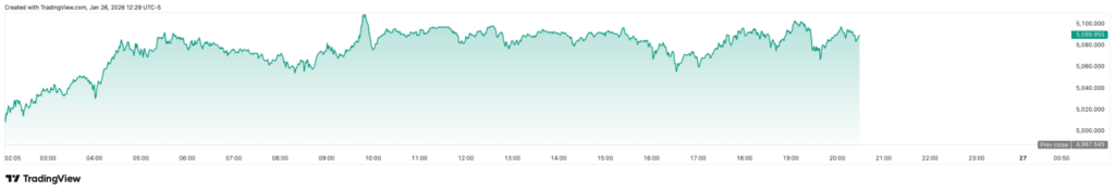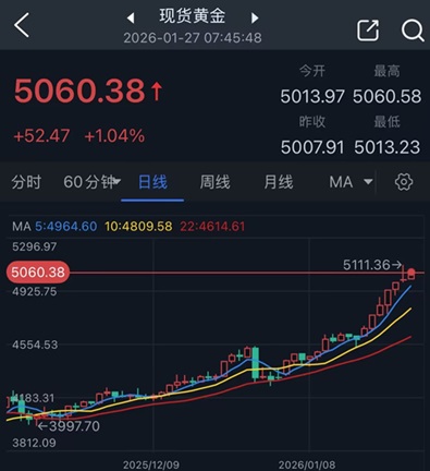 值得注意的是,黄金周一(1月26日)盘中一度暴涨至5111美元/盎司,创下历史新高,因为投资者在月底可能发生政府停摆的担忧加剧之际纷纷转向该资产。 截至目前,今年黄金价格已上涨近18%。