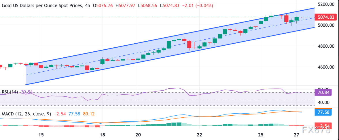 汇通财经APP讯——黄金市场目前展现出极强的上涨动能。现货黄金在前一日短暂回落至5000美元下方后迅速反弹,周二(1月27日)一度上涨1.5%至5086.77美元/盎司,连续第七个交易日保持积极走势,逼近周一创下的历史高点5110美元。这一轮强势行情的背后,是全球避险需求激增、美元指数显著疲软以及市场对美联储鸽派立场的强烈预期共同推动的结果。尽管周三美联储政策决议可能引发短期波动,但从基本面与技术面综合分析,黄金整体上行趋势依然稳固,回调空间有限,最小阻力方向继续指向更高位置。