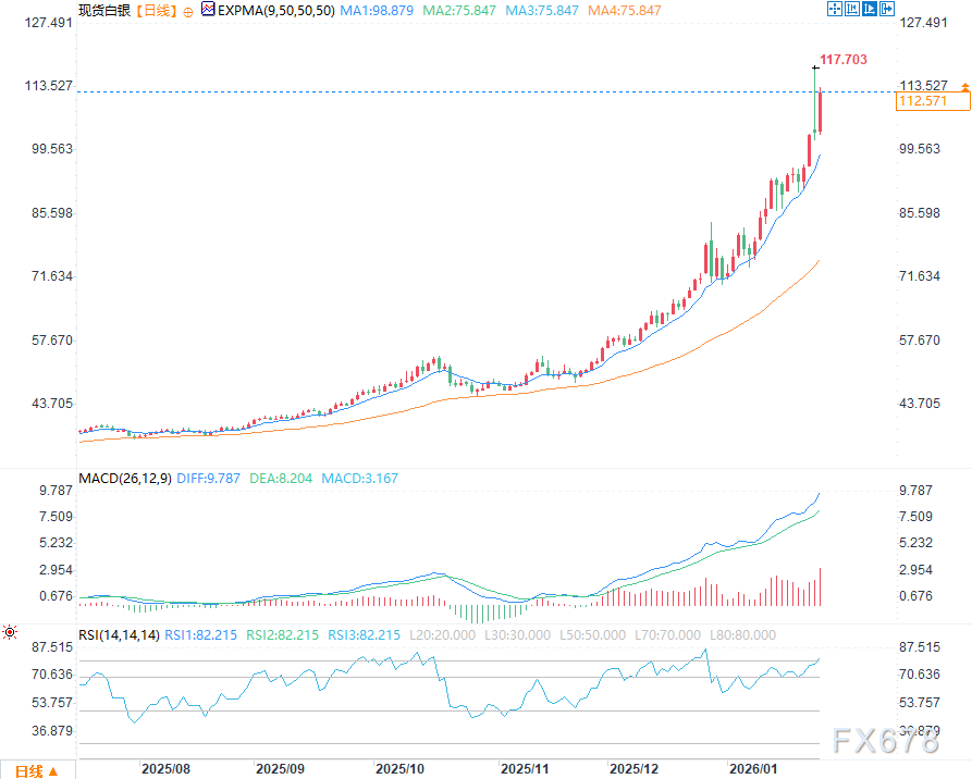 2026年伊始,白银价格出现历史罕见的加速上涨。1月尚未结束,白银累计涨幅已接近50%,月内振幅高达40%。在美元走弱、实际利率下行、黄金强势以及工业端供需担忧持续发酵的背景下,价格被快速推升至前所未有的高位。然而,伴随而来的极端波动与技术性过热信号,正成为今年对白银多头的第一次真正压力测试。当前更值得关注的,并非趋势是否立刻反转,而是市场是否正在从单边上涨,转向高位消化与再平衡。