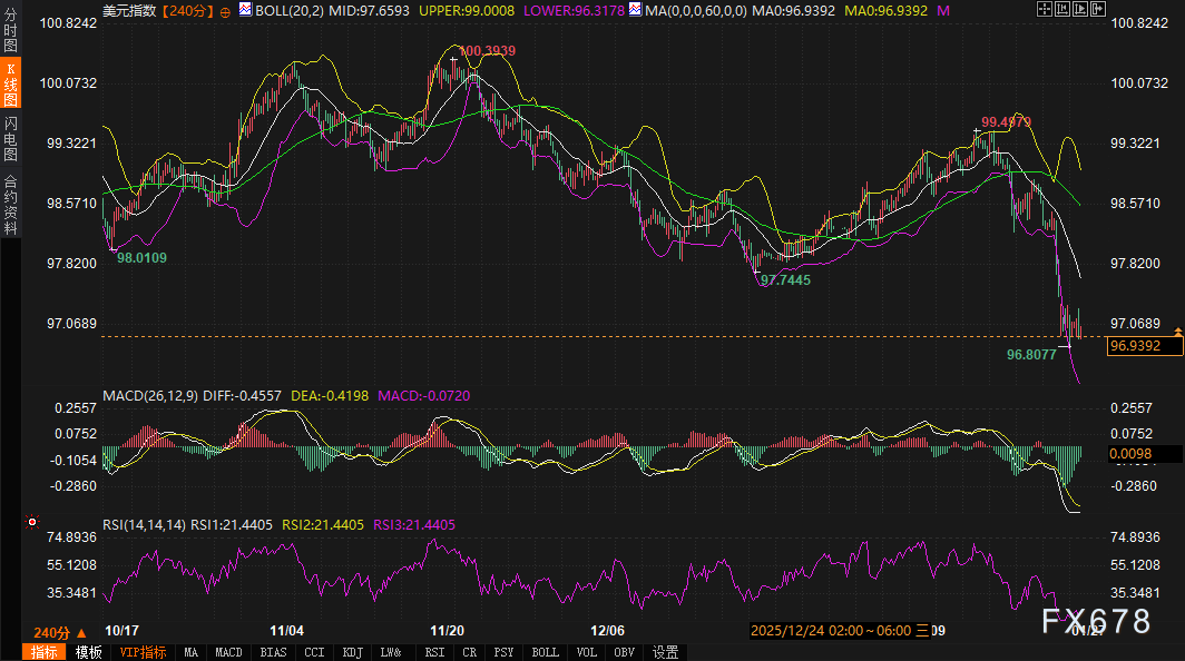 下方核心支撑: 96.3175(布林带下轨)、96.0000整数关口。