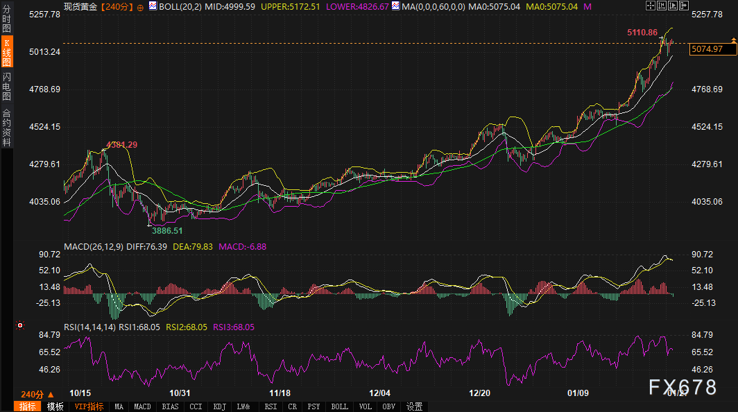 现货黄金(XAU/USD)目前在240分钟图中展现了清晰的上升通道,最新价在5074.75美元至5089.80美元区间波动,极度接近周一创下的5110.86美元的历史高位。