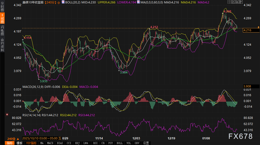 当前美债市场的变化是观察美元动向的关键窗口。根据最新的240分钟K线图显示,10年期美债收益率近期在3.984%至4.298%的宽幅区间内呈现震荡上行之势,最新报价维持在4.212%附近。