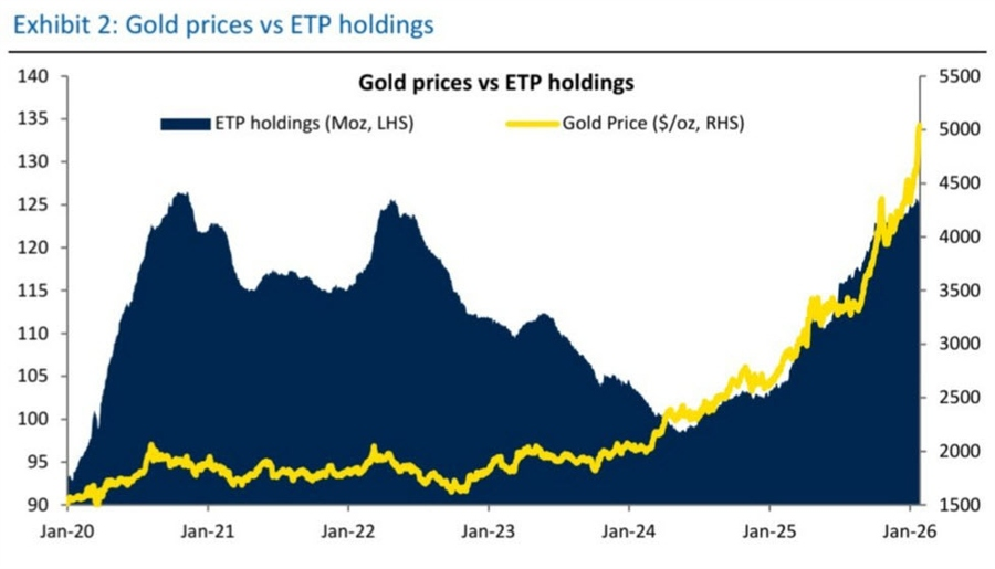 RBC表示,该行此前在“高情景”预测中原本预计金价将在第四季度后段升至5200美元区域,但在“高度不确定性所呈现出的狂热特征”叠加美元普遍走弱的背景下,金价上行节奏已被显著提前。 RBC在报告中强调了以下几个关键要点: 首先,金价上涨的速度明显超出该行预期。仅在2026年1月,黄金就已刷新8次历史新高,而2025年全年累计创下历史新高的次数为51次。 其次,宏观环境依然对黄金高度有利。RBC指出,贸易紧张局势、政治与地缘政治不稳定,以及围绕美联储独立性的担忧,是推动金价的主要催化因素。更为关键的是,该行并未观察到来自央行或投资者的需求出现回落迹象,交易所交易产品(ETP)的持仓规模正随着金价上涨而同步增加。 在历史对比方面,RBC以1976年、2007年和2015年的黄金行情作为参照,认为当前这轮上涨周期(约844天)并非异常值。按照历史平均规律推算,本轮金价涨势可能延续至今年9月或12月。 此外,RBC指出,若2026年的年度涨幅复制2025年约65%的涨幅水平,则按趋势外推,金价在今年年底可能升至7100美元/盎司。 RBC在报告中写道:“许多相同的支撑因素仍然存在……更重要的是,我们仍未感受到来自投资者或官方部门(即央行)在增持层面出现耗竭的迹象。” 该行总结称,尽管其他资产类别往往面临估值上限,但黄金的独特属性意味着当前价格水平尚未触及明确的“硬性天花板”。随着ETP持仓与金价之间的相关性重新建立,RBC认为,即便在其自身已属偏乐观的情景预测下,金价仍面临充足的上行风险。