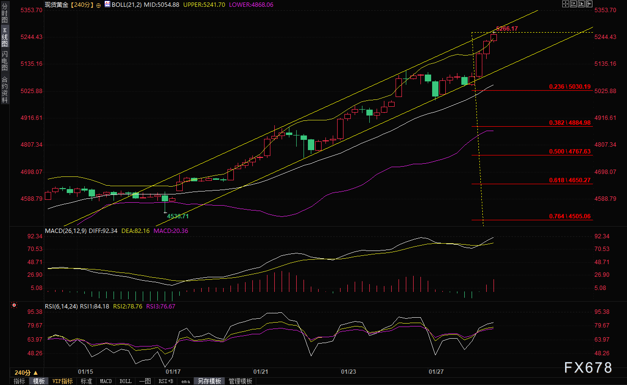 从技术面来看,4小时级别,黄金价格目前处于一个上升通道中,这一通道从4536美元起步,支撑着整体上涨趋势。目前正接近上涨通道上轨,通道的上轨阻力位接近5270美元,如果突破这一水平,将进一步延续涨势。移动平均收敛散度指标(MACD)显示,MACD线位于信号线上方,且两者均高于零线,这反映了多头动能的持续加强。然而,目前已经发出了顶背离信号,需要提防震荡筑顶风险。相对强弱指数(RSI)读数达到78,已进入超买区域,这警告上行空间可能在通道顶部受到限制。