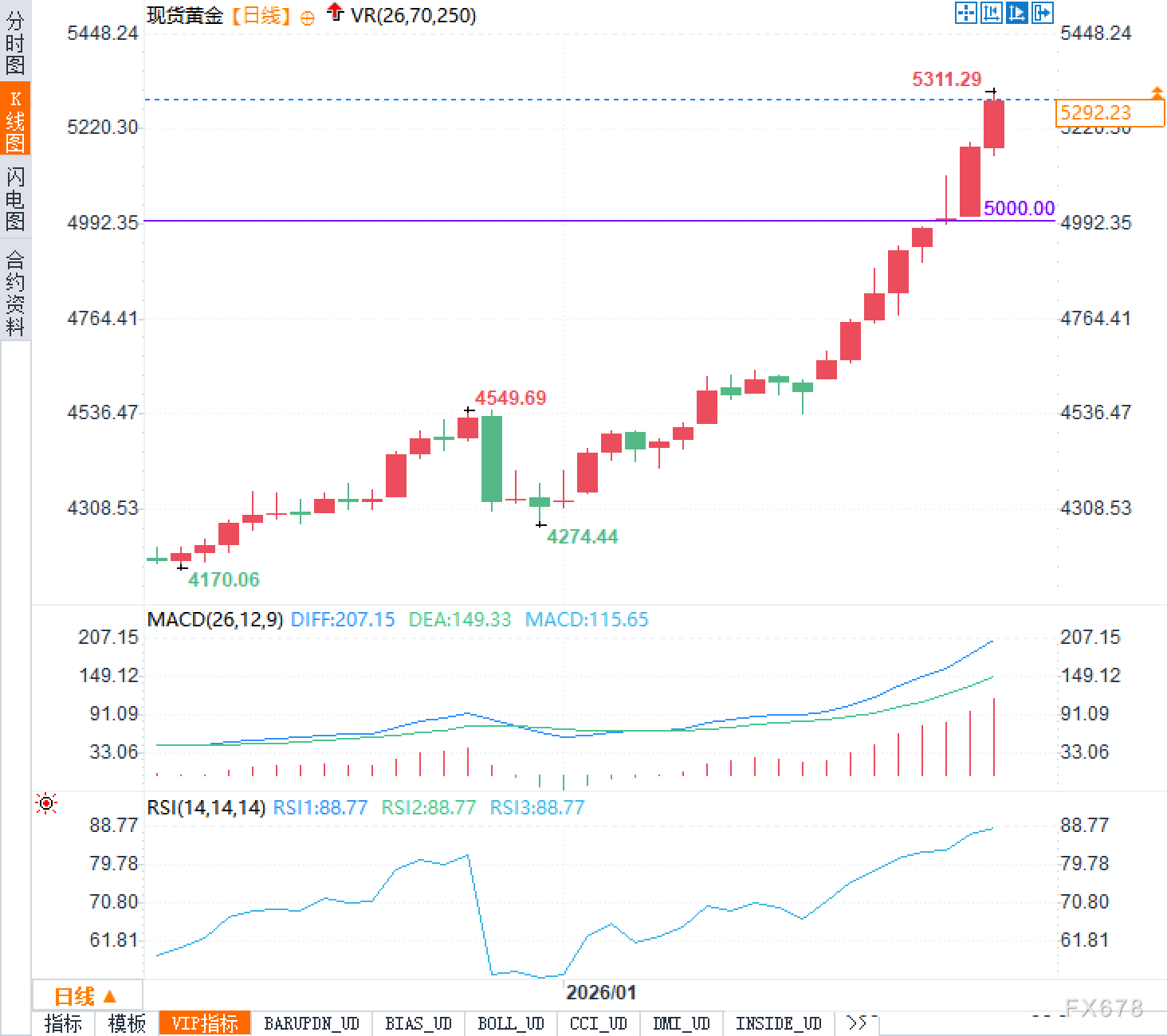不过,在强势表象之下也暗藏隐忧。技术指标显示,虽然MACD仍处于扩张状态——DIFF为207.15,DEA为149.33,MACD柱达115.65,表明多头动能尚未衰竭,但RSI(14)已升至88.77,远超常规超买区,释放出明显的过热信号。这意味着追涨的边际收益正在下降,任何风吹草动都可能引发快速回调。尤其当价格逼近前高5311.29美元区域时,阻力效应或将加剧,市场更容易出现高位震荡和获利了结行为。