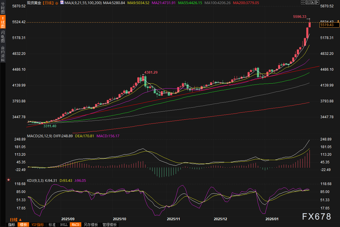 汇通财经APP讯——周四(1月29日)亚市早盘,COMEX黄金期货价格首次触及每盎司5600美元大关,刷新历史新高,这不仅仅是数字的跳跃,更是地缘政治紧张与货币政策交织下的产物。特别是在美伊冲突升级的背景下,投资者涌入黄金市场避险,推动金价连续八个交易日上涨,涨幅惊人。美联储维持利率不变的决议虽带来短暂震荡,但未能阻挡避险买盘的汹涌势头。截止07:50,现货黄金最高触及5596.33美元/盎司,COMEX期金最高触及5626.8美元/盎司,均刷新历史记录高点,最高涨幅分别为3.35%和5.37%,由于短线涨幅较大,短线已经出现多头获利了结,目前均回吐部分涨幅,现货黄金目前回落至5500关口附近。