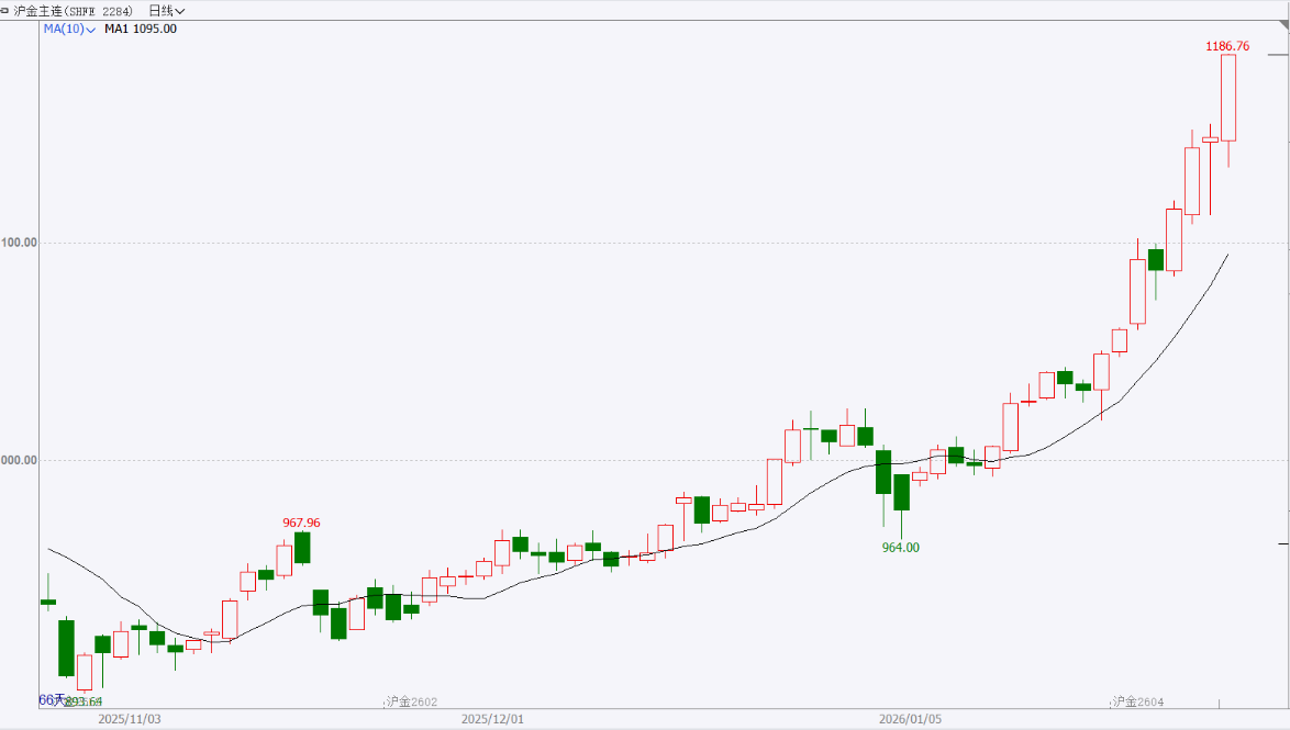 截至前一个交易日收盘,沪金主力合约大幅上涨,盘中再创历史新高。