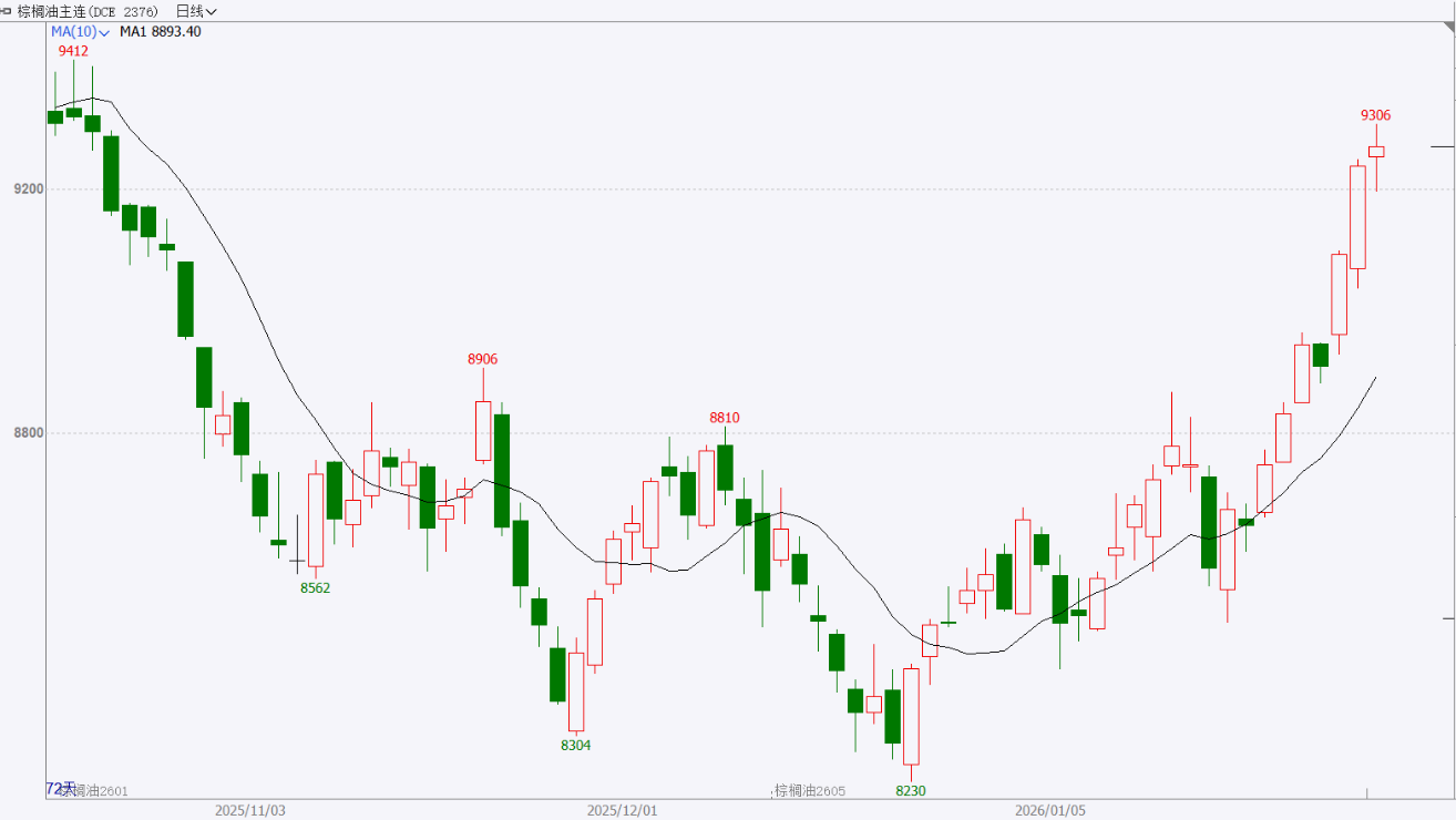 走势分析:供给端收紧,需求端强劲。近期豆油、菜油等关联植物油价格同步上涨,形成板块联动效应。棕榈后市上方或仍有空间。