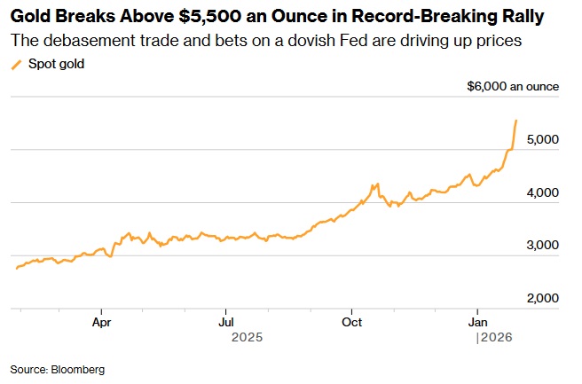 金价周三惊人暴涨4.6%,创下自2020年3月新冠疫情高峰期以来的最大单日涨幅。 今年贵金属价格大幅上涨,原因是地缘政治紧张局势加剧,以及市场对美联储独立性担忧,这些因素推动了货币贬值交易。周四,白银也创下历史新高。 美国有线电视新闻网(CNN)当地时间周三报道称,据知情人士透露,在华盛顿和德黑兰就限制伊朗核计划和弹道导弹生产进行的初步讨论未能取得进展后,美国总统特朗普(Donald Trump)正在考虑对伊朗发动新的重大打击。 知情人士表示,特朗普目前正在考虑的选项包括美国军方针对伊朗领导人以及被认为对杀害事件负责的安全官员的空袭,以及对伊朗核设施和政府机构的打击。 知情人士透露,特朗普尚未就如何继续采取行动做出最终决定,但他认为,随着美国航空母舰打击群进入该地区,他的军事选项相比本月初已有所扩大。 特朗普周三在Truth Social上发布消息,要求伊朗回到谈判桌上,达成“公平公正的协议——不发展核武器。”他警告称,下一次美国对伊朗的打击“将比去年夏天更严重”,当时美国军方曾攻击了伊朗的三个核设施。 美联储新主席恐更加鸽派 美联储周三如预期般维持利率不变的决定。随着新任美联储主席预计将在今年晚些时候接替鲍威尔(Jerome Powell),贝莱德公司(BlackRock Inc.)高管里克·里德(Rick Rieder)——一位主张更激进降息的专家——已成为主要的接班人选。 交易员们正加大对鸽派政策转变的押注,这将有利于没有收益的贵金属。 道明证券(TD Securities)全球商品策略负责人Bart Melek表示:“人们认为下一任美联储主席可能会更加鸽派。美联储主席的人选将是决定今年黄金价格走势的关键因素。” 上周日本债券市场的大规模抛售,再次印证了市场对巨额财政支出的担忧。与此同时,市场猜测美国可能干预市场以支撑日元,这令美元承压,也使得贵金属价格对大多数买家而言更加便宜。 地缘政治动荡刺激金银今年飙升 随着投资者涌入黄金市场,金价今年迄今已飙升超过25%。白银的涨幅更为显著,接近65%。
