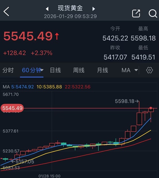 金价稍早一度飙升至5598.18美元/盎司,刷新纪录高位,日内涨幅达到181美元。