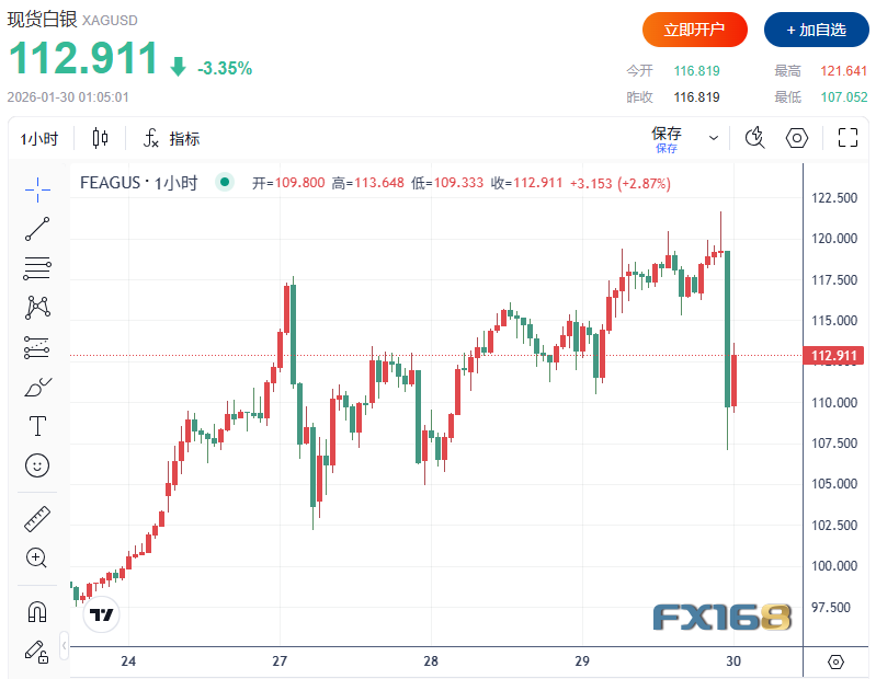 High Ridge Futures金属交易主管David Meger表示:“在贵金属创下新的历史高点后,市场出现了剧烈的获利回吐式抛售。” 尽管如此,现货黄金本月累计涨幅仍高达19%,本周以来上涨约3.6%。 市场人士指出,黄金需求的来源正在显著扩展,从加密资产资金到全球央行均在持续加码配置。GoldSilver Central董事总经理Brian Lan表示:“贵金属正处于聚光灯下,投资者总是倾向于追逐回报率更高的资产。” 地缘政治风险亦为金价提供支撑。美国总统特朗普周三敦促伊朗就核问题展开谈判,而德黑兰方面则威胁将对美国、以色列及其盟友采取报复行动。 与此同时,加密货币稳定币发行商Tether的首席执行官表示,公司计划将投资组合中10%至15%的资金配置至实物黄金;全球最大黄金ETF——SPDR Gold Trust的黄金持仓量亦升至近四年来的高位。 在货币政策方面,美联储周三宣布维持利率不变。市场关注焦点转向特朗普即将公布的美联储主席人选,以接替任期将于5月结束的鲍威尔。市场普遍预计,美联储下一次降息或在6月。 白银价格同样出现剧烈回调。现货白银短线下跌超12美元,跌幅扩大至约8%,刷新日低至107.052美元/盎司,此前曾触及121.641美元/盎司的高位。今年以来,白银价格累计涨幅已超过50%,主要受供应短缺与动量资金推动。