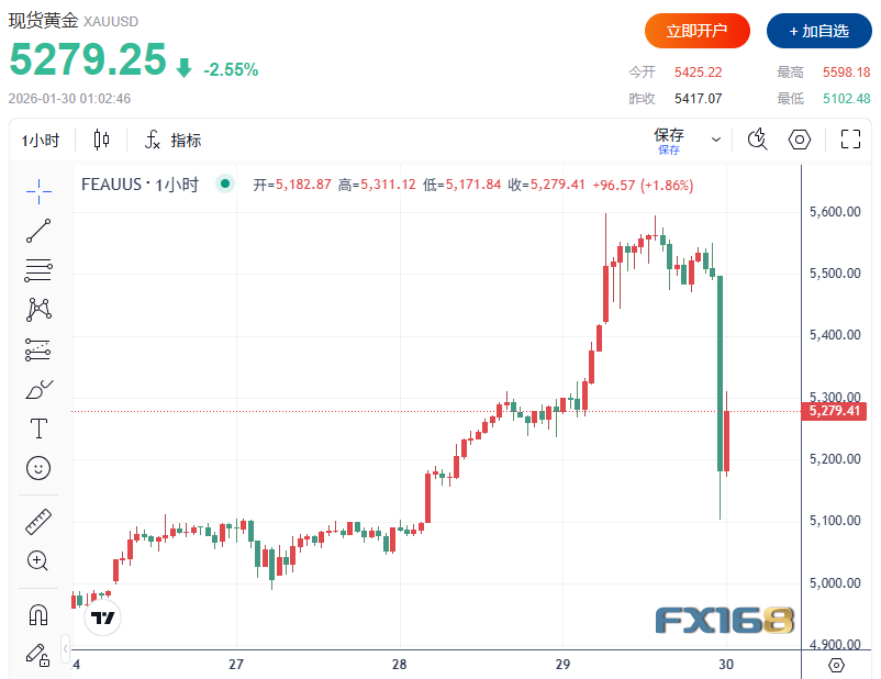 1月29日的美盘时段,黄金市场发生了极端的波动。现货黄金在短短几分钟内冲至5591.61美元的历史高点,随后却突遭巨量抛单,引发价格急剧回撤。30分钟内,金价从高位回落约450美元,最低一度跌至5104美元。这一波动令市场参与者猝不及防,并迅速成为全球金融市场的焦点。