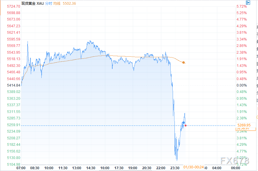 汇通财经APP讯——周四(2026年1月29日)美盘时段,黄金市场经历了震撼的波动。现货黄金在触及历史新高后,仅用30分钟便大幅回撤,最大跌幅接近450美元,最低探至5104美元。这次“闪崩”并非由单一因素驱动,而是由市场情绪、宏观政策与交易机制等多重因素共同作用的结果。