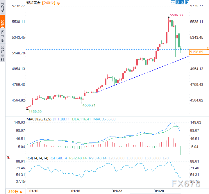 —周五(1月30日)亚欧时段,现货黄金连续第二日遭遇大规模抛售,现交投于每盎司5195美元附近,日内跌幅约3.4%。此前,金价自本月初以来已呈现抛物线式上涨,涨幅超过25%,并在过去两周左右连续创下一系列历史新高,前一交易日一度创下5596.33美元的新高,而后遭遇滑铁卢。在美国参议院就本财年剩余时间联邦政府拨款达成协议的乐观情绪推动下,美元获得了一定的上行动力。这有助于缓解短期的政治不确定性,并成为削弱黄金的关键因素。