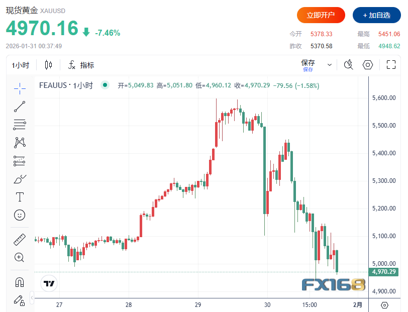 现货黄金下跌约8%,至4948.62美元/盎司。