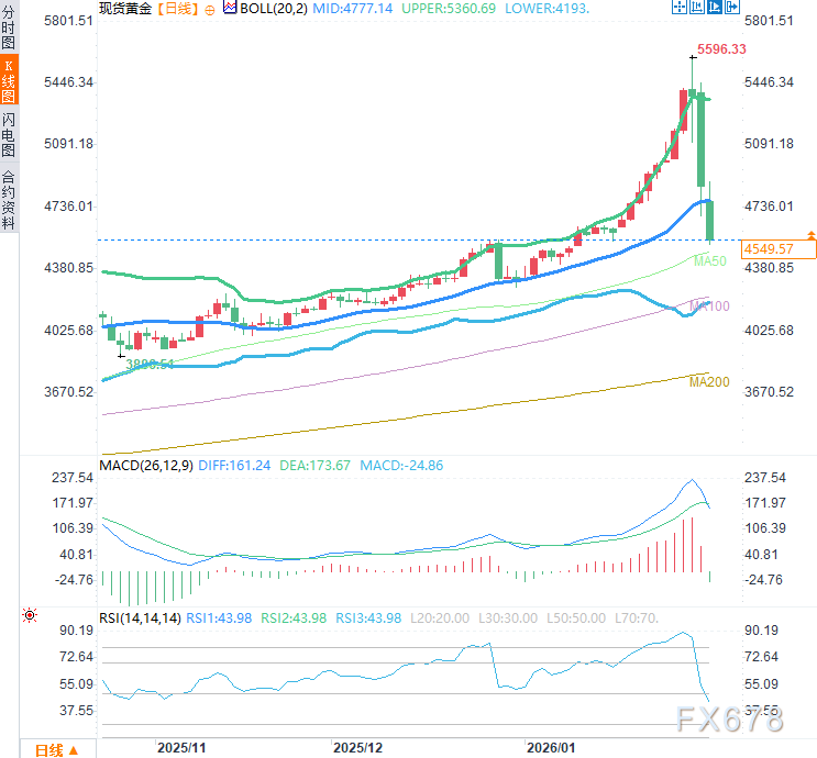 汇通财经APP讯——周一(2月2日)亚市时段,现货黄金在获利了结盘压力下大幅下挫,延续前两个交易日跌势,现交投于每盎司4555美元附近,日内跌幅约6%,截至13:54,此前一度跌7.5%至三周低点4497.39美元/盎司,上周五金价跌幅近10%。此前,凯文·沃什被提名为下一任美联储主席的消息缓解了市场对美联储独立性的担忧,美国政治稳定性显现迹象,促使金价在上周创下历史高点后延续跌势。
