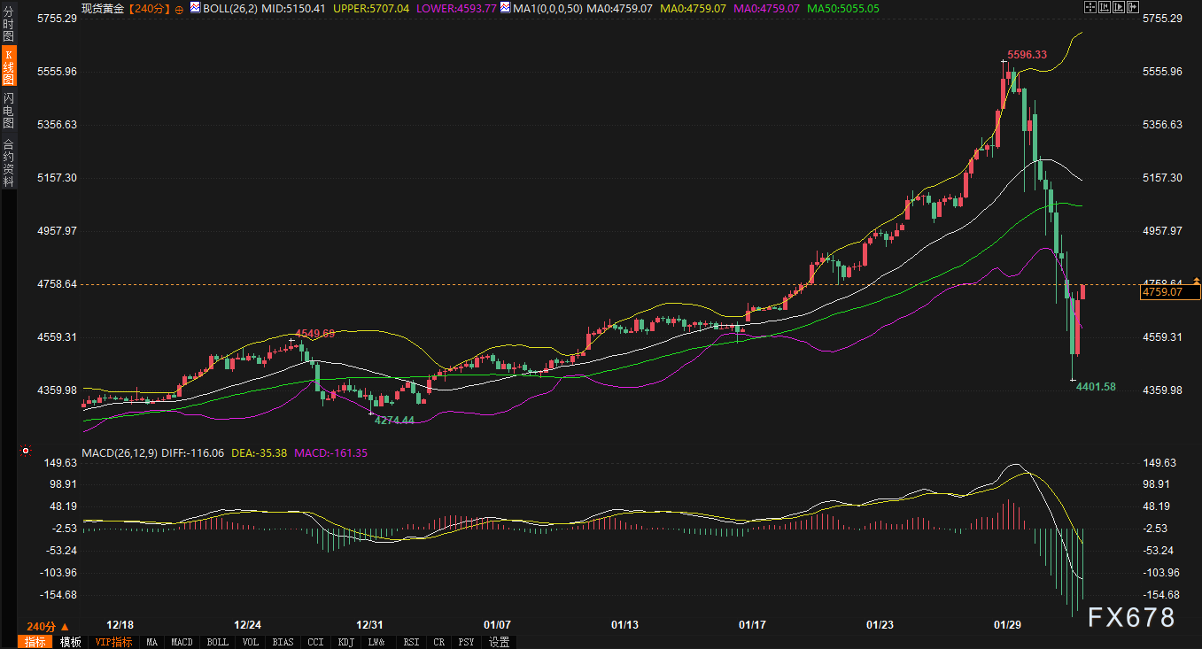 4小时图显示,金价经历瀑布式下跌后,已远离布林带上轨(5706.74),目前位于中轨(5150.57)下方运行,下轨支撑在4594.39附近。50周期均线(5055.13)已转为关键阻力。MACD指标位于零轴下方,DIFF与DEA均呈深幅负值,柱状线未见明显收敛,显示空头动能仍占据主导,但极端超卖状态也酝酿技术性反弹需求。未来2-3日,预计金价将进入超跌后的震荡修复阶段。 上方第一阻力区间位于4800-4850美元(近期暴跌后的反弹高点及心理关口),更强阻力位于4950-5050美元区域(50周期均线及前期成交密集区)。下方关键支撑需关注4700美元整数关口,若失守,则可能进一步下探至4600-4650美元区域(布林带下轨及年内起涨点附近)。盘中关注点在于,CME保证金上调正式生效后,市场抛压是否会减缓,以及任何关于美联储政策路径的新闻是否会导致美债收益率出现意外下跌,从而为黄金提供喘息之机。