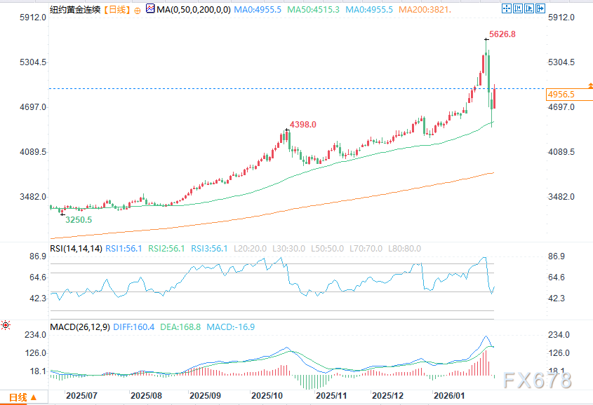 上周金价从逼近5600美元的历史高点剧烈回调后,逢低买盘重新入场。现货黄金盘中报4952美元附近,周一曾跌至约四周低点4402美元附近,随后开启反弹。