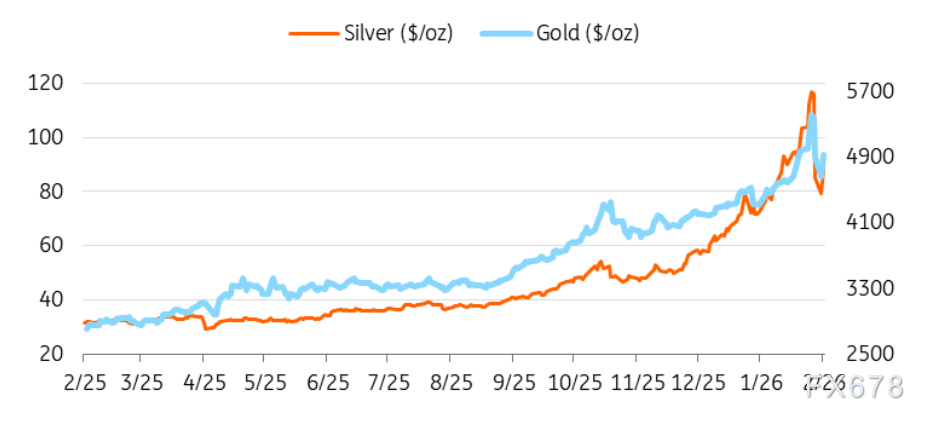 此次抛售前,贵金属刚刚经历了为期三个月的史诗级上涨:黄金从每盎司4000美元飙升至5500美元上方,白银从每盎司约50美元暴涨至近120美元。本轮大涨主要由来自中国的投机买盘推动——从零售交易者到大型股票基金纷纷转向大宗商品,增量资金将价格推至极端高位,直至上周突然反转。