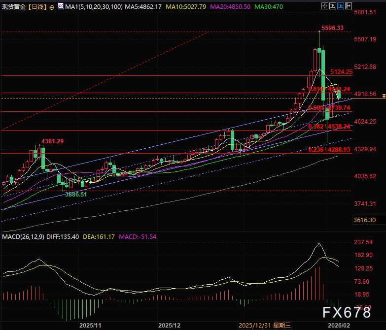 技术面上,现货黄金反弹至0.618分位之后受到较大阻力,目前受到下方上升通道的支撑,和4941的上涨0.618分位的压制,后续上方压力位还有5124,是靠近但低于0.764分位的压力位。